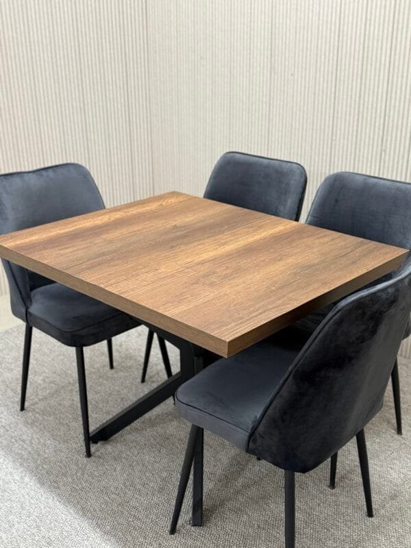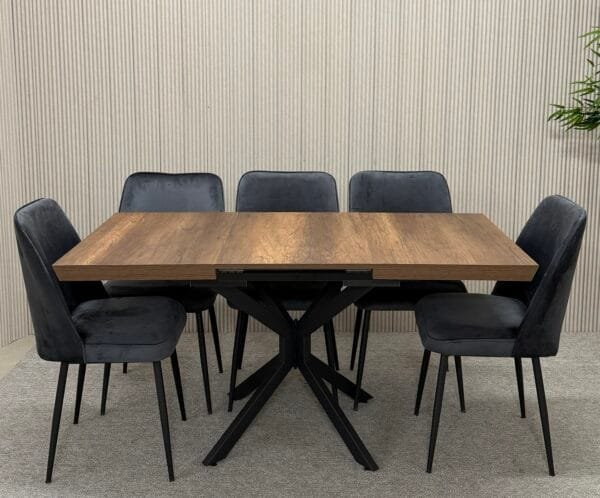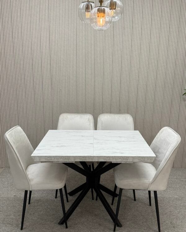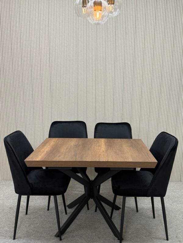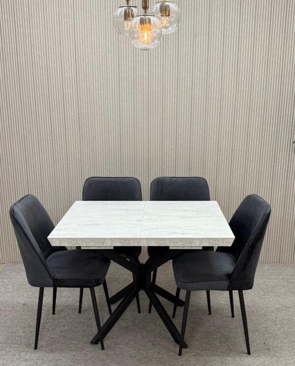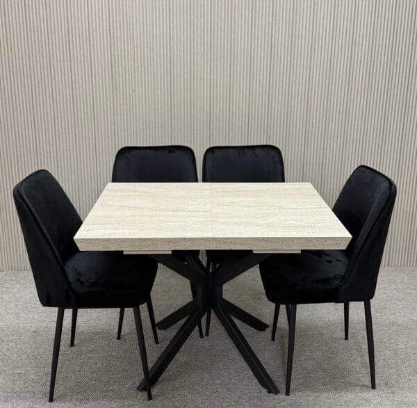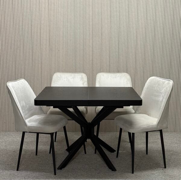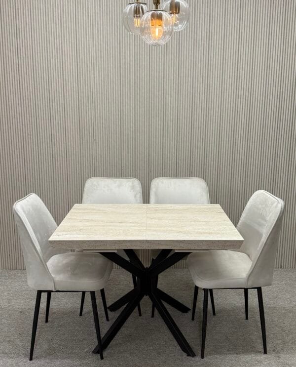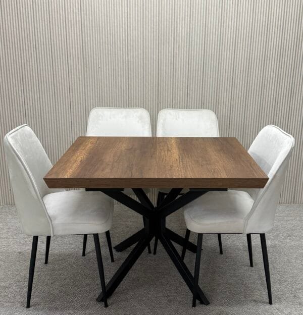 תיאור: שולחן אוכל מעוצב ודגם טורינו, בעל מנגנון פתיחה נוח להארכה עד 150 ס”מ. כולל 4 כיסאות תואמים לנוחות מקסימלית. אידיאלי לחללים קטנים ובינוניים, מתאים לפינת אוכל או למטבח.